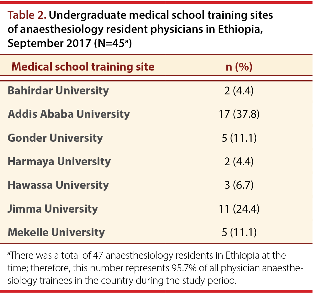 Methods: Semistructured, self-administered questionnaires were distributed to all anaesthesiology residents in 2017 in Ethiopia. The questionnaire addressed demographic factors, exposure to the field of anaesthesiology during undergraduate training, reasons for the choice of anaesthesiology as a specialty, the teaching and working environment, and future career plans.